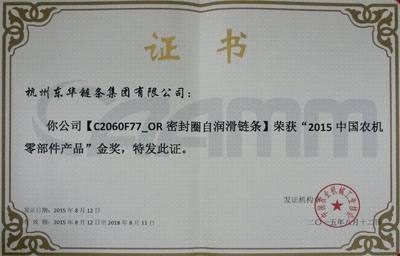 會上,與會人員主要圍繞會議主題進行技術(shù)、市場、創(chuàng)新、發(fā)展等廣泛交流。會議期間,評比并頒發(fā)了2015中國農(nóng)機零部件46項金獎產(chǎn)品和25項創(chuàng)新獎產(chǎn)品。東華申報的C2060F77_OR和C2062H_ORSDF1密封圈鏈條經(jīng)久保田、福田雷沃等知名整機企業(yè)的推薦,專家委員會最終評審決定,對 東華申報的這兩款密封圈鏈條分別授予金獎和創(chuàng)新獎。這個獎項是目前農(nóng)機鏈條企業(yè)的最高榮譽,體現(xiàn)了東華農(nóng)機鏈條處于國內(nèi)同行領(lǐng)先水平,得到廣大農(nóng)業(yè)主機單位的贊譽和認可。東華生產(chǎn)的農(nóng)機鏈條也暢銷國際市場,與CLASS、紐荷蘭等世界500強企業(yè)配套。