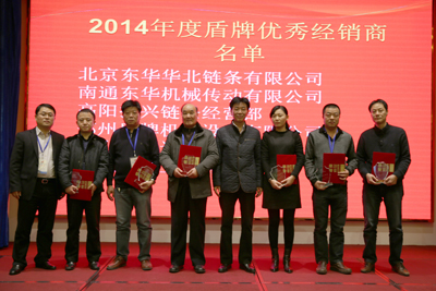 最后,內銷公司總經理戴迪漢宣讀了東華19名2014年度“優秀經銷商”名單;盾牌公司總經理錢文孝宣讀了盾牌6名2014年度“優秀經銷商”名單。董事長宣碧華向獲獎經銷商頒發了獎杯和證書,并合影留戀。