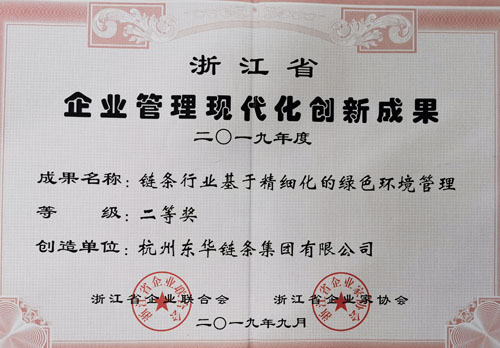 日前,杭州市企業(yè)聯(lián)合會召開換屆選舉大會,會上表彰獎勵了2019年度杭州市企業(yè)管理現(xiàn)代化創(chuàng)新成果獎,公司由管理部推薦的“鏈條行業(yè)基于精細化的綠色環(huán)境管理”榮獲杭州市企業(yè)管理現(xiàn)代化創(chuàng)新成果三等獎。該成果也被浙江省企業(yè)聯(lián)合會授予浙江省2019年企業(yè)管理現(xiàn)代化創(chuàng)新成果二等獎稱號。