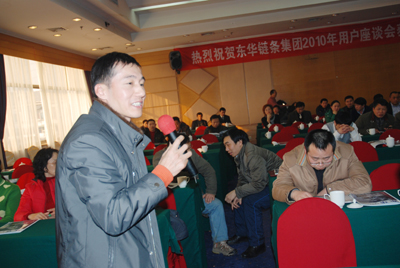 首先,董事長宣碧華致歡迎辭(另刊)。他說,一年一度的東華集團用戶座談會在天豪大酒店召開。首先非常感謝我們的經銷商、主機廠、用戶一年來對東華的大力支持,使我們度過了2009年的金融危機,也非常感謝以張總為代表的領導班子兢兢業業,一年來的辛勤勞動;同時感謝戰斗在銷售線上的業務員的辛勤工作,取得好的銷售業績。