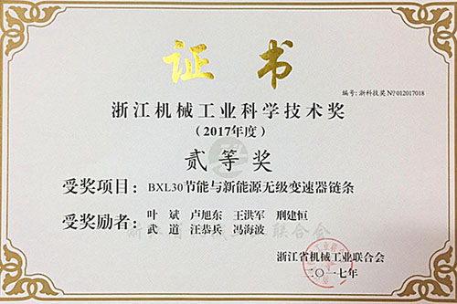 又訊:日前,公司生產(chǎn)的BXL30節(jié)能與新能源無級變速器鏈條被浙江省機(jī)械工業(yè)聯(lián)合會(huì)評為“浙江機(jī)械工業(yè)科學(xué)技術(shù)獎(jiǎng)貳等獎(jiǎng)”。