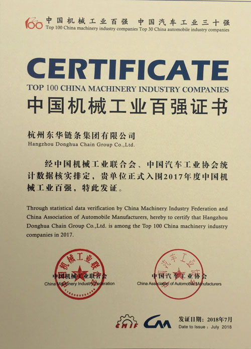 東華鏈條集團連續三年榮登中國機械工業百強榜
