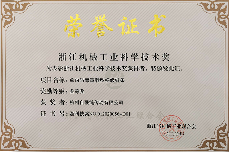 4月29日,浙江省機械工業(yè)聯(lián)合會召開會員大會,會上表彰了2020年度浙江機械工業(yè)科學(xué)技術(shù)獎。集團下屬子公司杭州自強鏈傳動公司的高端產(chǎn)品“單向防彎重載型梯級鏈條”榮獲三等獎。這是東華集團產(chǎn)品創(chuàng)新項目連續(xù)九年榮獲浙江機械科技獎,也是2020年度全省機械工業(yè)科技創(chuàng)新成果獎項中唯一的鏈傳動企業(yè)的高端產(chǎn)品獲獎。
