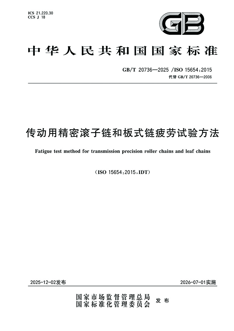 近日,國家市場監(jiān)督管理總局和國家標準化管理委員會聯(lián)合發(fā)布了261項推薦性國家標準。其中,由全國鏈傳動標準化技術(shù)委員會歸口、東華鏈條集團負責及參與研制/修訂的兩項新版鏈傳動國家標準正式獲批,分別為GB/T 20736—2025《傳動用精密滾子鏈和板式鏈疲勞試驗方法》和GB/T 6074—2025《板式鏈、連接環(huán)和槽輪 尺寸、測量力、抗拉載荷和動載載荷》。兩項新標準將于2026年7月1日起實施。