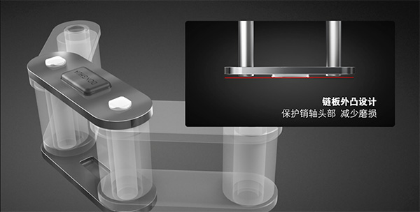 | 1)鏈板外凸設計,保護銷軸頭部,減少磨損; | 2)銷軸表面硬化處理,提高使用壽命。 |